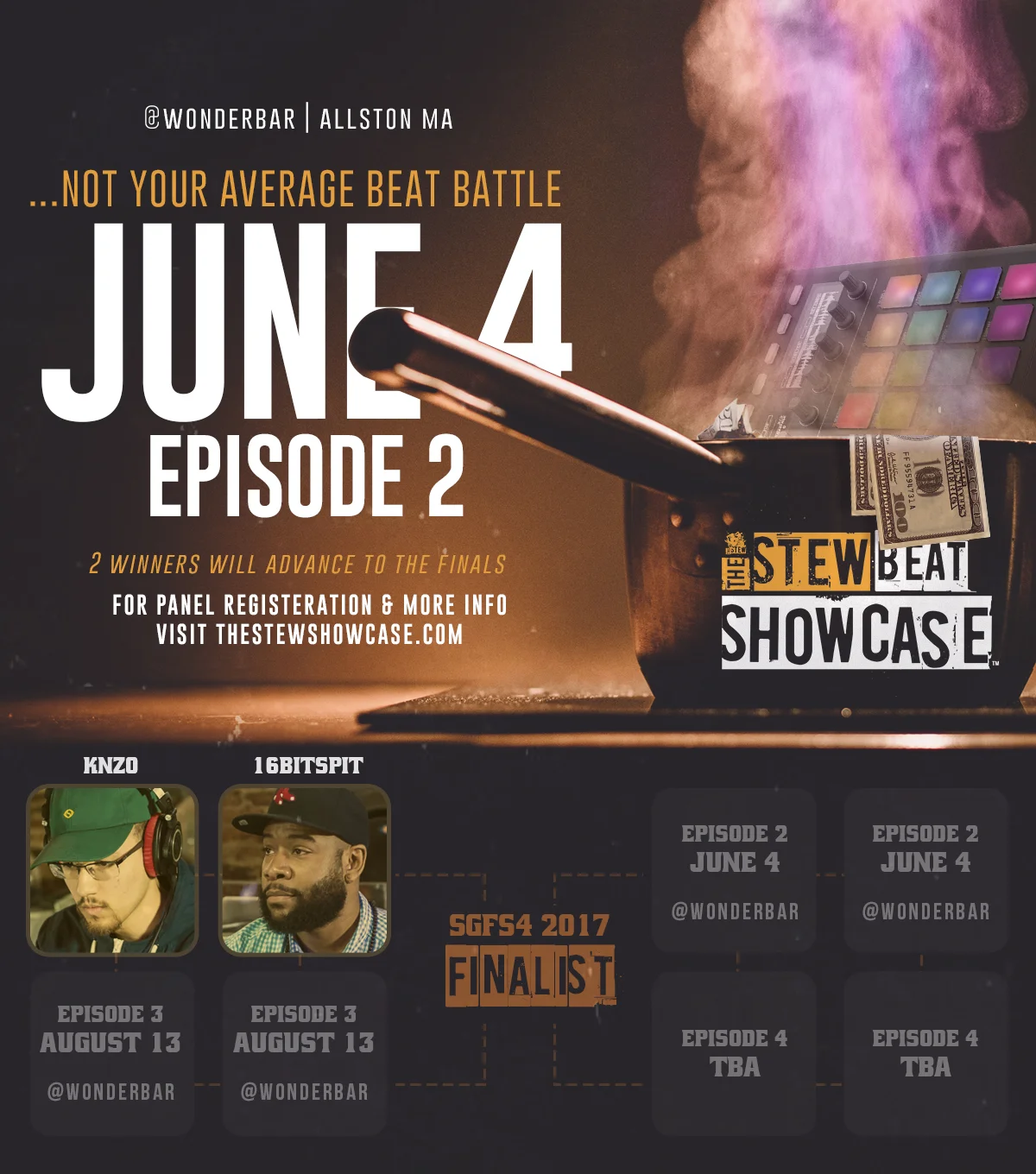 /April 9th 2017 was nothing short of a spectacle. Bboys/BGirls took the dance floor during #OpenKitchen, SoundBridge demoed their DAW for our audience, emcee Chris Borelli performed & debuted his music video "Accolades," plus our SGFS3 Champ Ellio joined the Judging and kept it real with our panelist. Episode 1 brought out some incredible talent. Panelist included: Too Deep (MA), Doctor Igor (MA), Kel C (NY), Knzo (MA), 16BitSpit (MA), & 1st Official (MA) - The BeatClubPodcast's pick.
