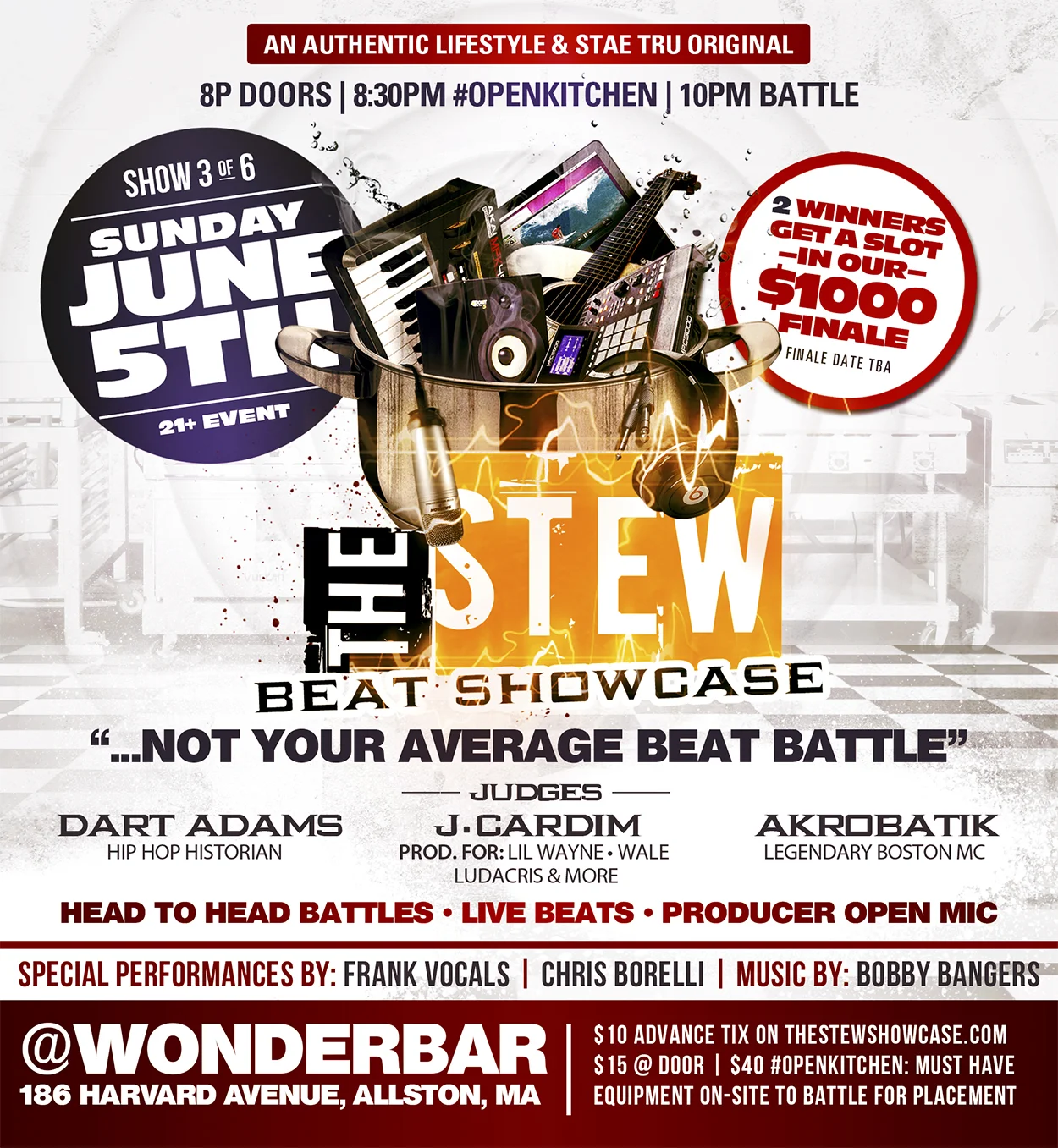 /So you're a beat maker who just found out about The Stew and would like to join the competition. Well, you still have a chance. During the Stew Beat Showcase we'll hold an #OpenKitchen (our producer open-mic) where one (number can vary each showcase) lucky beat-maker will win a wildcard slot on the panel. All you have to do is show up early on the scheduled event date (8PM sharp) and register (in person) for the open kitchen. Please keep these things in mind:
