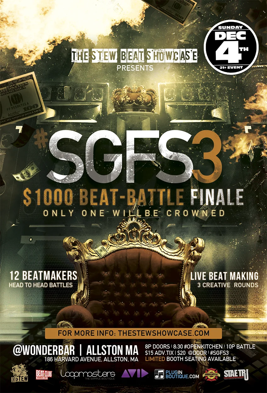 2 wildcard slots, on our $1,000 panel, will be presented to the winner of our producer open-mic, better known as the Stew's #OpenKitchen (on-site registration and entry fee required to participate. First come, first served). So who will take home the title... Vinyl Villian, Neech Beatz, D-Will, Flip Jackson, Ellio, Marco Marcel, International Show, Melks or will it be our wildcard from the #OpenKitchen?